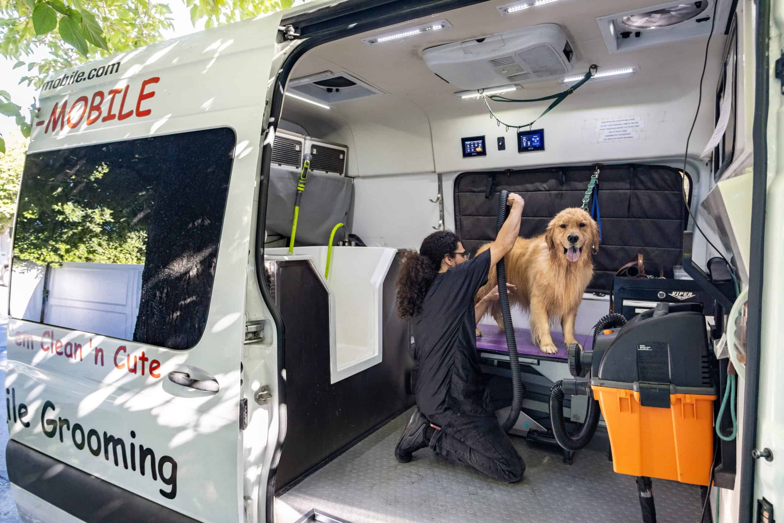 We’ve built a pet business franchise centered around grooming services that prioritize the well-being of dogs and cats. Our fully customized, eco-friendly grooming vans are built with air conditioning, heat, electricity, and water right in the vehicle, so our certified, expert groomers have everything they need to deliver top notch services. Since our vans are powered by lithium-ion batteries, they don’t rely on the need for generator power, and we follow non-idling practices to minimize fuel use and air pollution during every appointment. It’s a commitment to the environment that our competitors can’t match.
